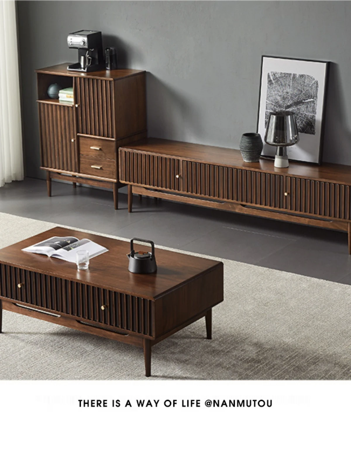 North American Black Walnut Solid Wood TV Stand and Coffee Table Set – Minimalist Luxury Style with Storage for Nordic Living Room