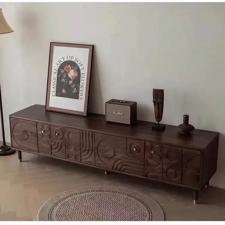 Nordic Black Walnut Vintage TV Cabinet - Solid Wood French Carved Design for a Chic Living Room, Elevate Your Space with this Luxurious Floor Cabinet