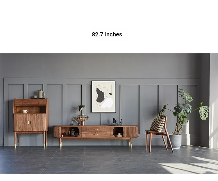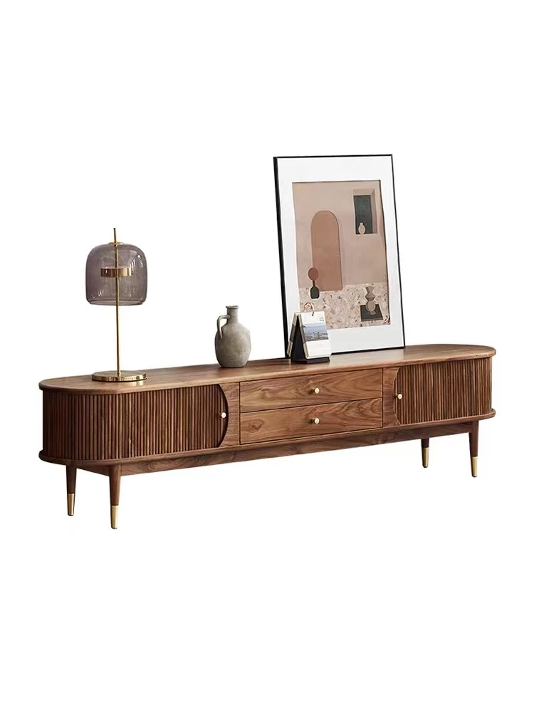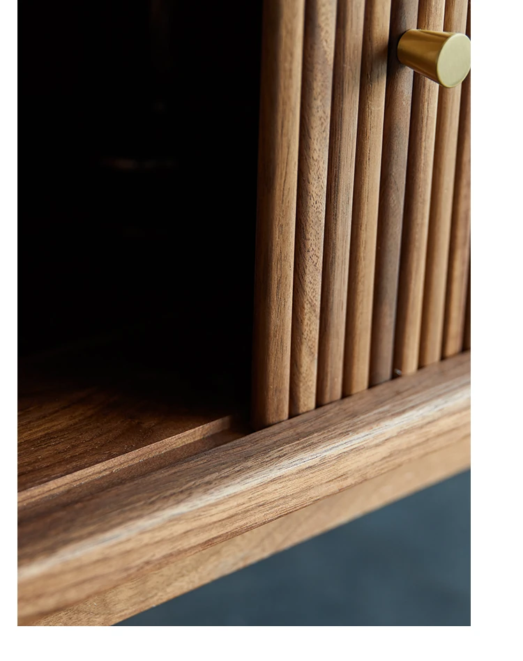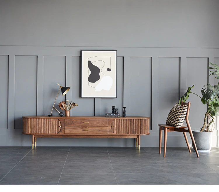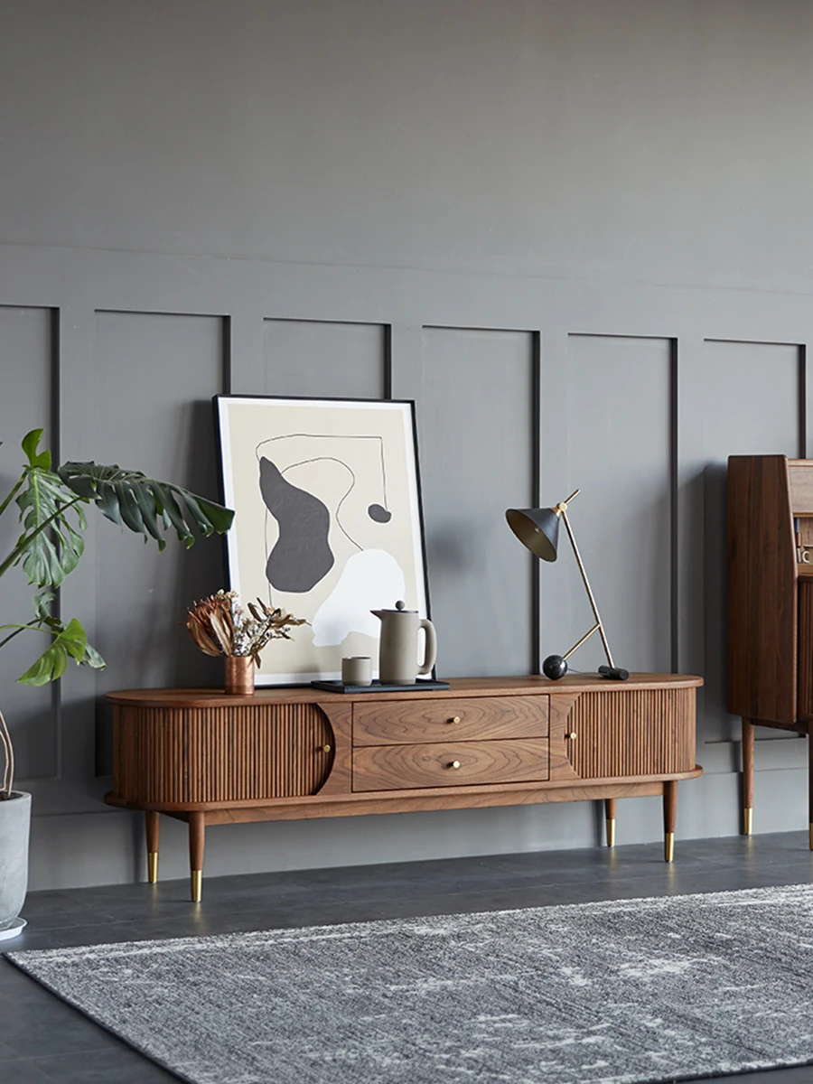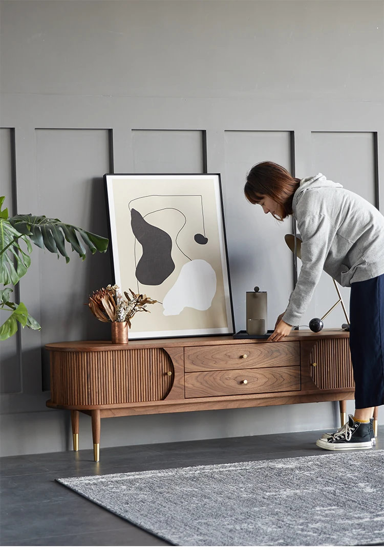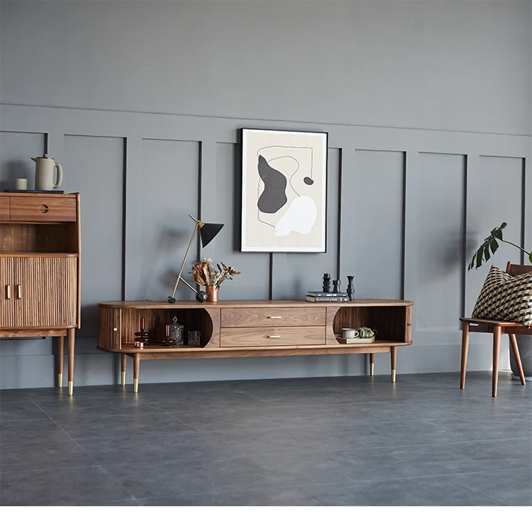 北欧風の無垢材テレビボード、ウォールナット色のヴィンテージ風デザイン。シンプルでモダン、上品な雰囲気を演出するオープン扉の映像収納家具。