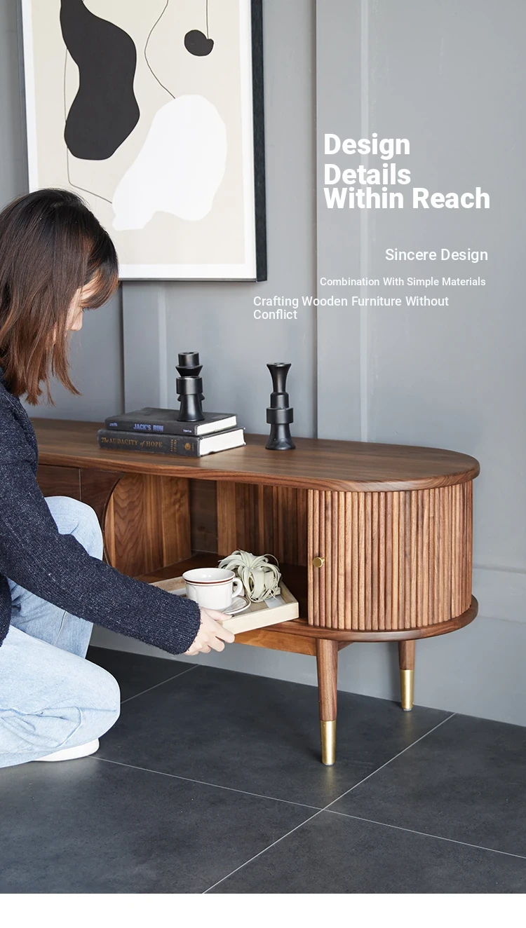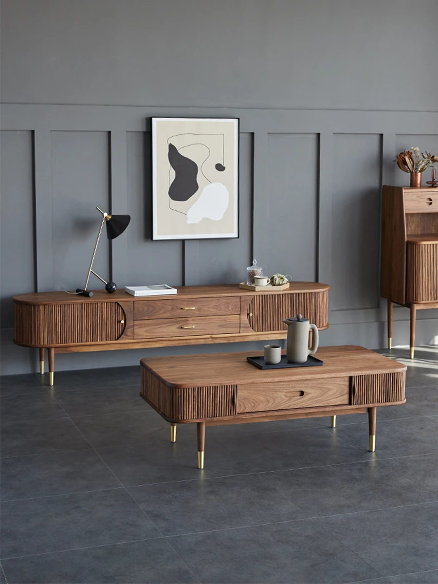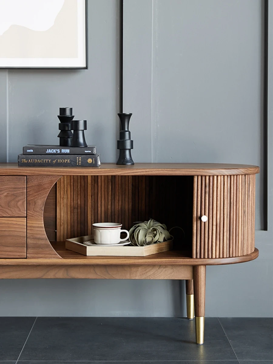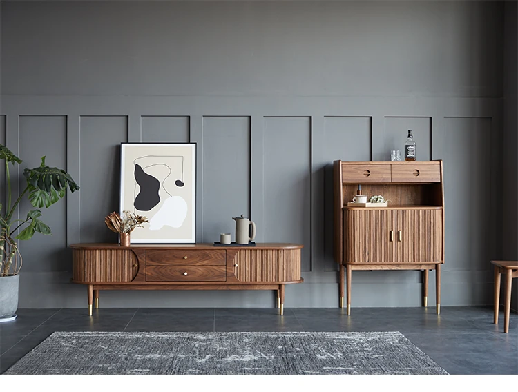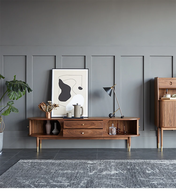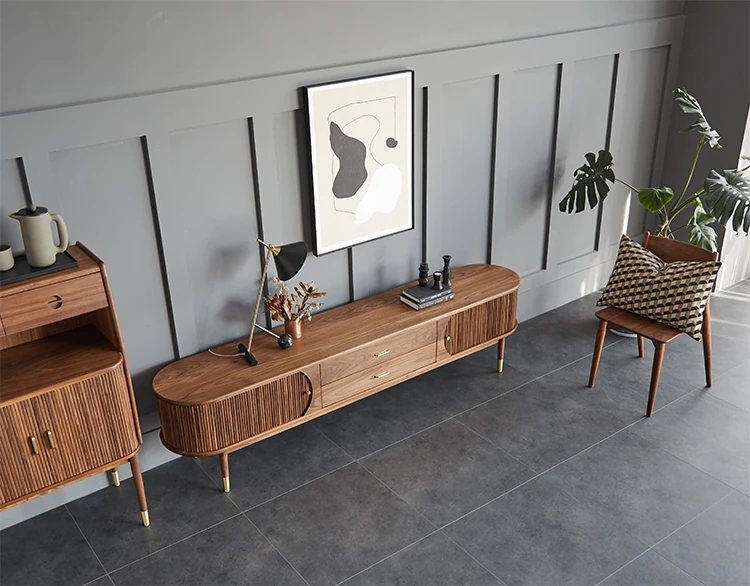北欧風の無垢材テレビボード、ウォールナット色のヴィンテージ風デザイン。シンプルでモダン、上品な雰囲気を演出するオープン扉の映像収納家具。