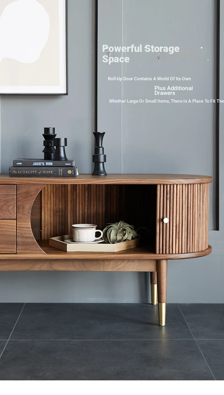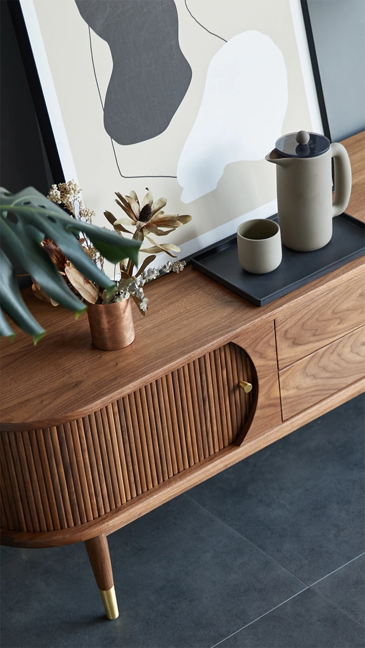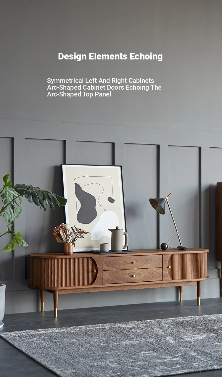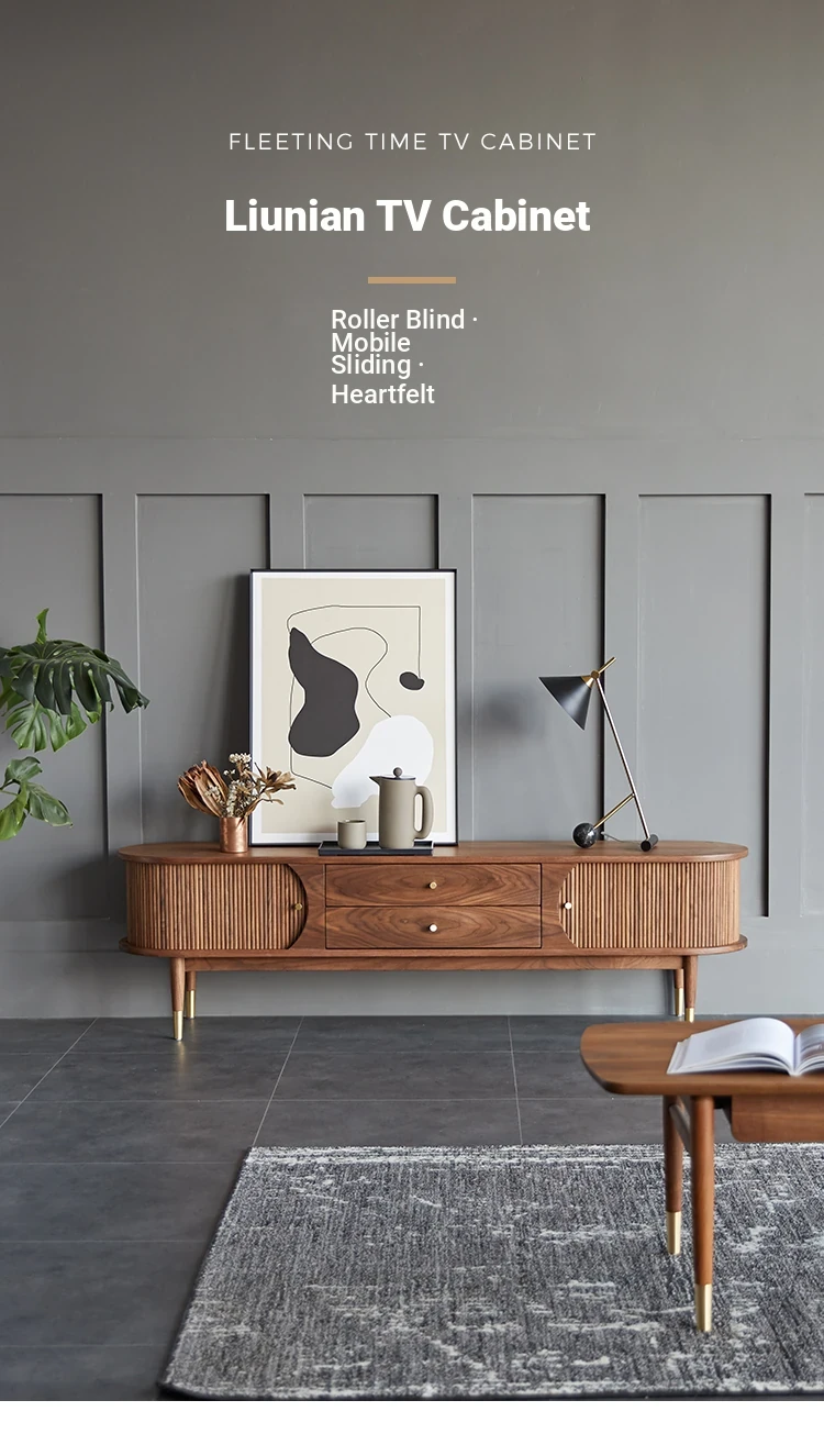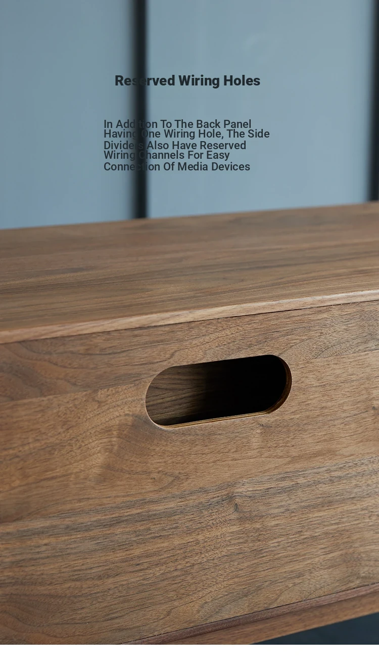北欧風の無垢材テレビボード、ウォールナット色のヴィンテージ風デザイン。シンプルでモダン、上品な雰囲気を演出するオープン扉の映像収納家具。